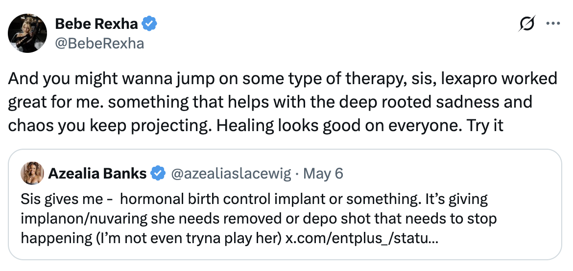 Azealia Banks responded, mocking Bebe Rexha’s mental health medication.
