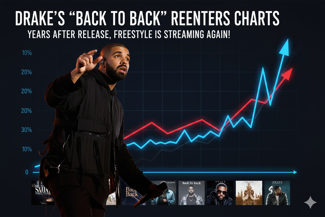 Drake’s classic diss track Back to Back has reentered streaming charts years after its original release. Fans revisited the song during renewed online debates about hip-hop beef and lyrical dominance.