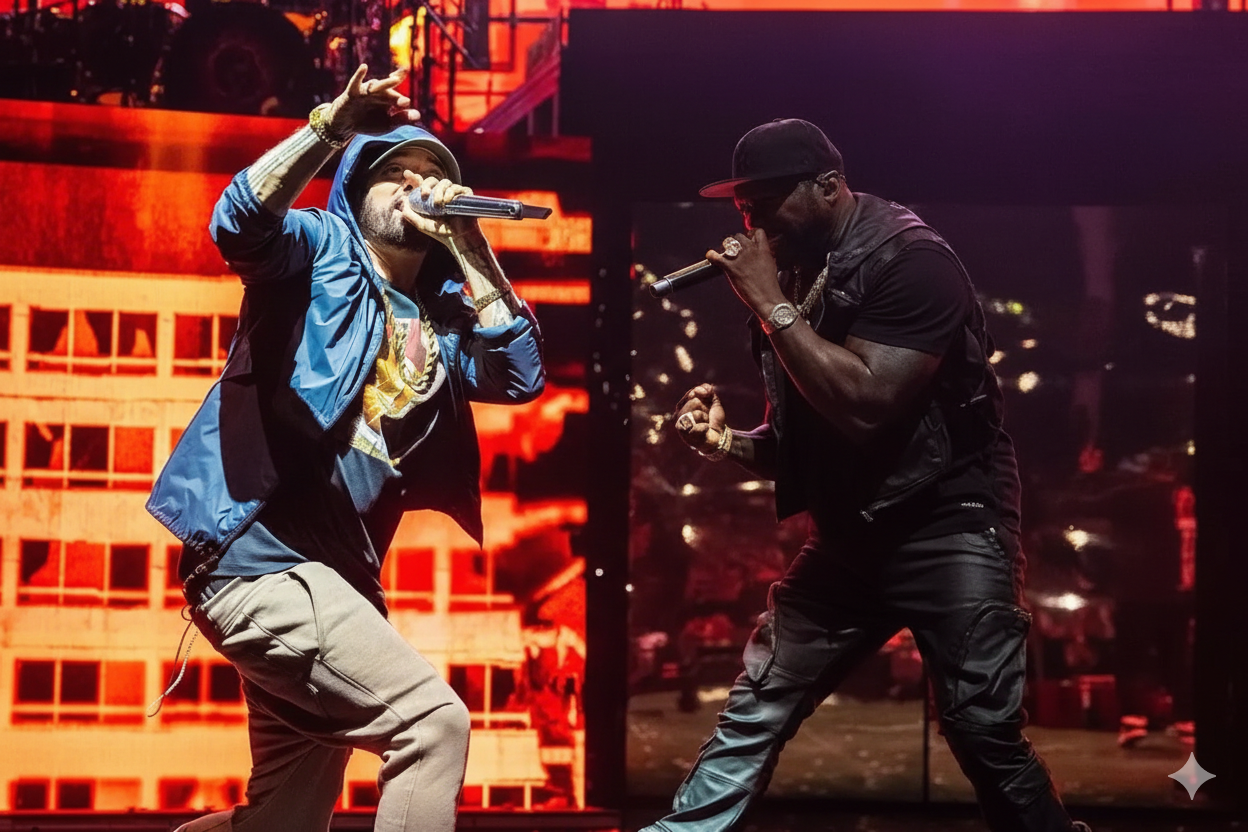 During a sold-out stop on Eminem’s “The Final Lap Tour”, fans were stunned when 50 Cent unexpectedly joined Eminem on stage. The moment came mid-set, with the crowd erupting as the two performed classic records together.
