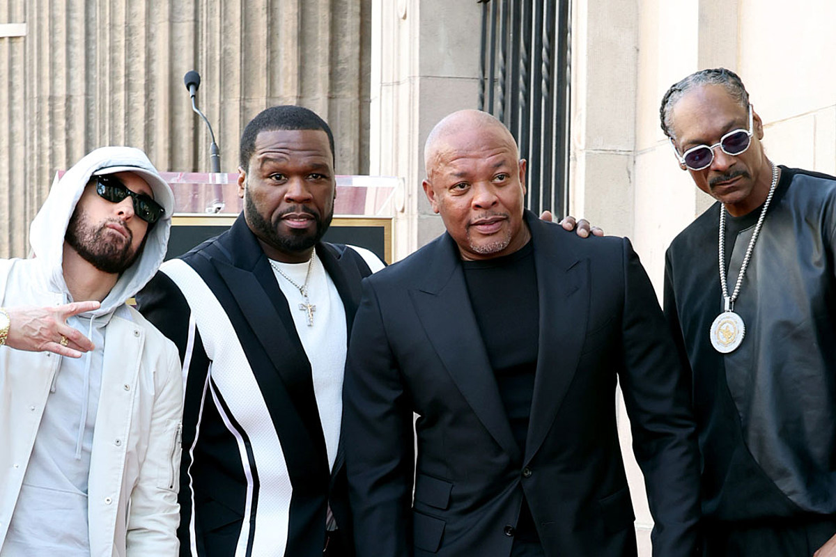 HOLLYWOOD, CA – MARCH 19: (LR) Eminem, 50 Cent, honoree Dr. Dre and Snoop Dogg attend the Dr. Dre Hollywood Walk of Fame Star Awards on March 19, 2024 in Hollywood, California.